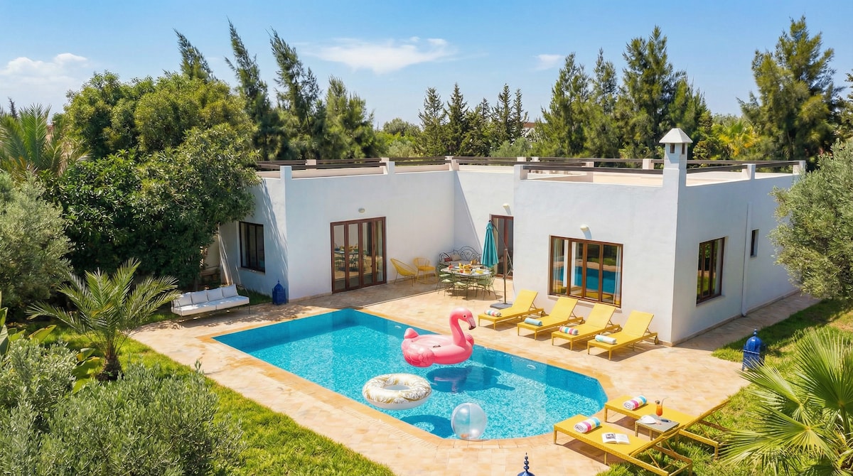 Charming Family Villa, 2levels, independent, spacious, well illuminated, a big private pool of 75m² and a beautiful garden. Located on the countryside, 16km from Essaouira on Sidi Kaouki rd, it has a luxurious finish, chimney, open fire place in the garden, olive and fruit trees and two beautiful Terraces with pergolas. Modern and peaceful. Airport at 6.5km and shops and a supermarket at 10min. You will need a vehicle to get around.