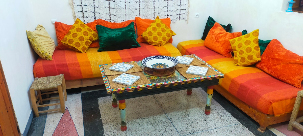 Notre authentique Riad, chaleureux et lumineux, est situé dans la médina d'Essaouira à 500 mètres de la plage et à l'entrée d'une porte principale. Cet havre de paix offre plusieurs espaces exterieurs végétalisés et variés; de restauration et de repos pour profiter selon les différents moments de la journée. Des chambres avec literie confortable, salles de bain équipées de produit de qualité. Un espace de travail. Cuisinière à disposition, pour préparer de délicieux repas réservés en option.