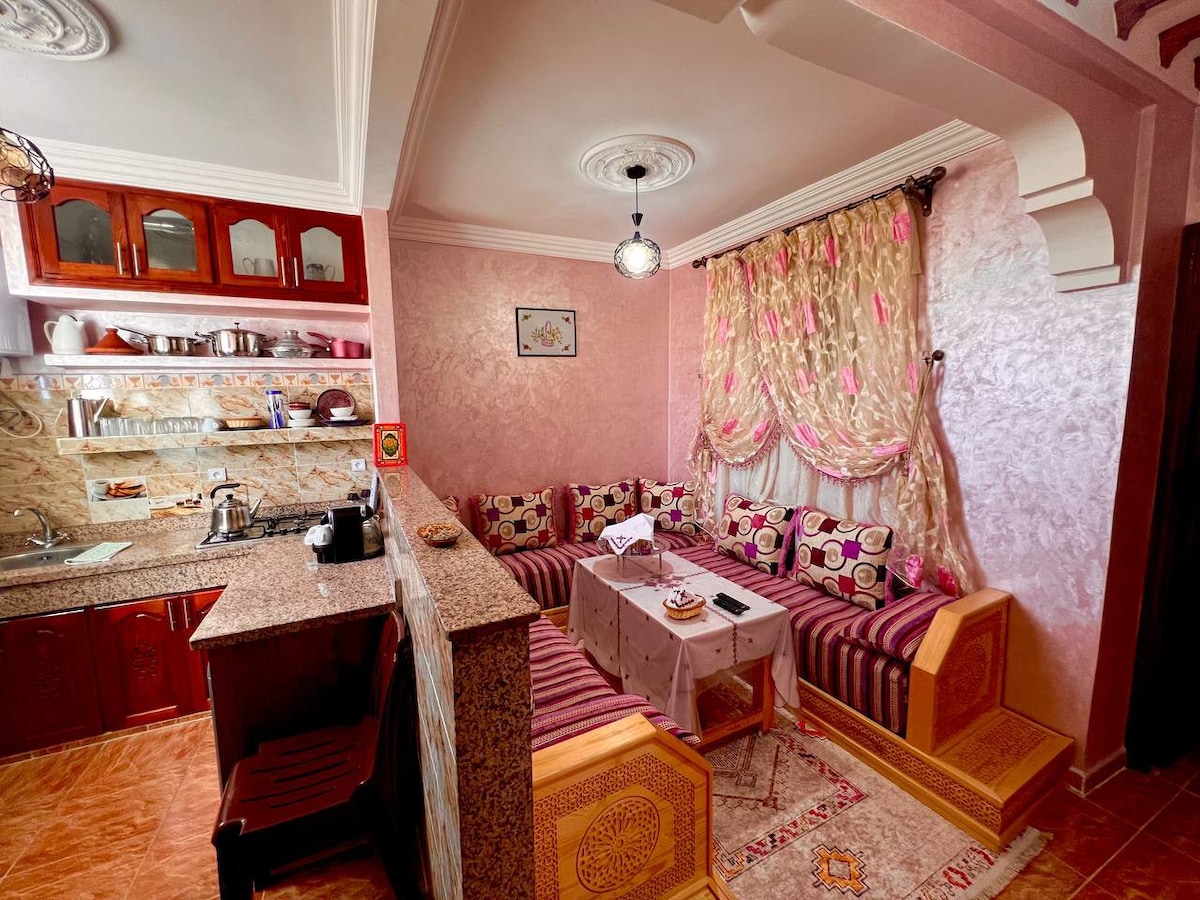 Situé au calme et pourtant au cœur de la medina d'Essaouira, a proximité de tous commerces, cafés, restaurants, taxis et plages.Appartement lumineux et confortable avec terrasse privée et aménagée.Cuisine équipée avec frigidaire,grille pain, cafetière électrique, théière....,2 chambres confortables,SDB, deux salons. Beaucoup de luminosité et de caractère . Nous pouvons accueillir de 4 a 5 personnes, où 4 adultes et deux enfants..Je m'appelle Faical je suis votre hôte et vous êtes les bienvenus