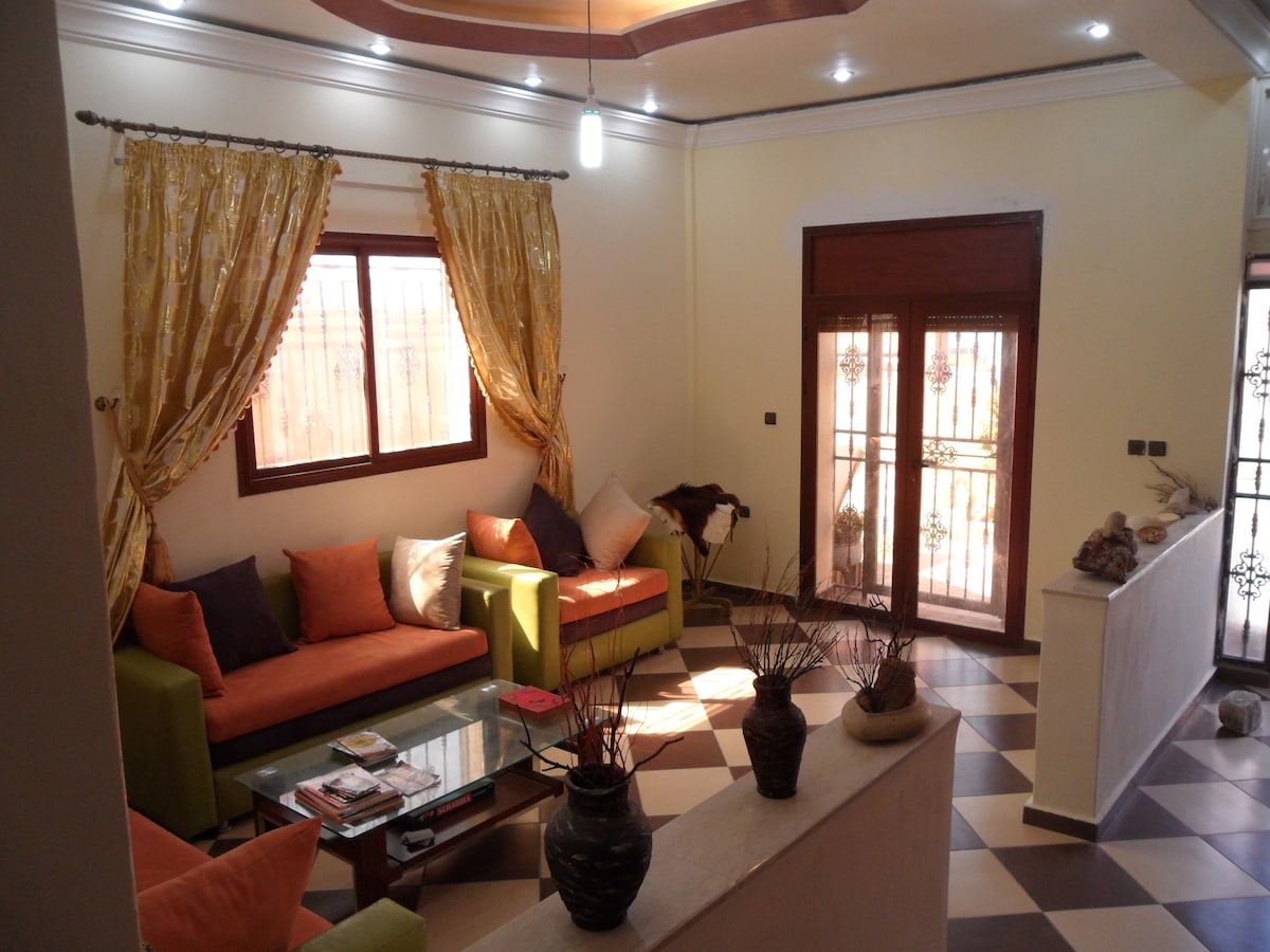 Chambre avec terrasse sur l'Atlas située à 3' de Taghazout dans une maison berbère. La chambre donnant sur le patio dispose d'unecheminée, d'un jardin ombragé, paradis des oiseaux. Repas "faits maison" par vos hôtes berbères (en option). Vous serez les seuls locataires durant votre séjour. Sans oublier notre terrasse sur la mer à Taghazout pour des couchers de soleil,.et des grillades maison..Une chambre en plus et une cuisine ? Réservez sur l'annonce "Le Riad Berbère, charme et authenticité"