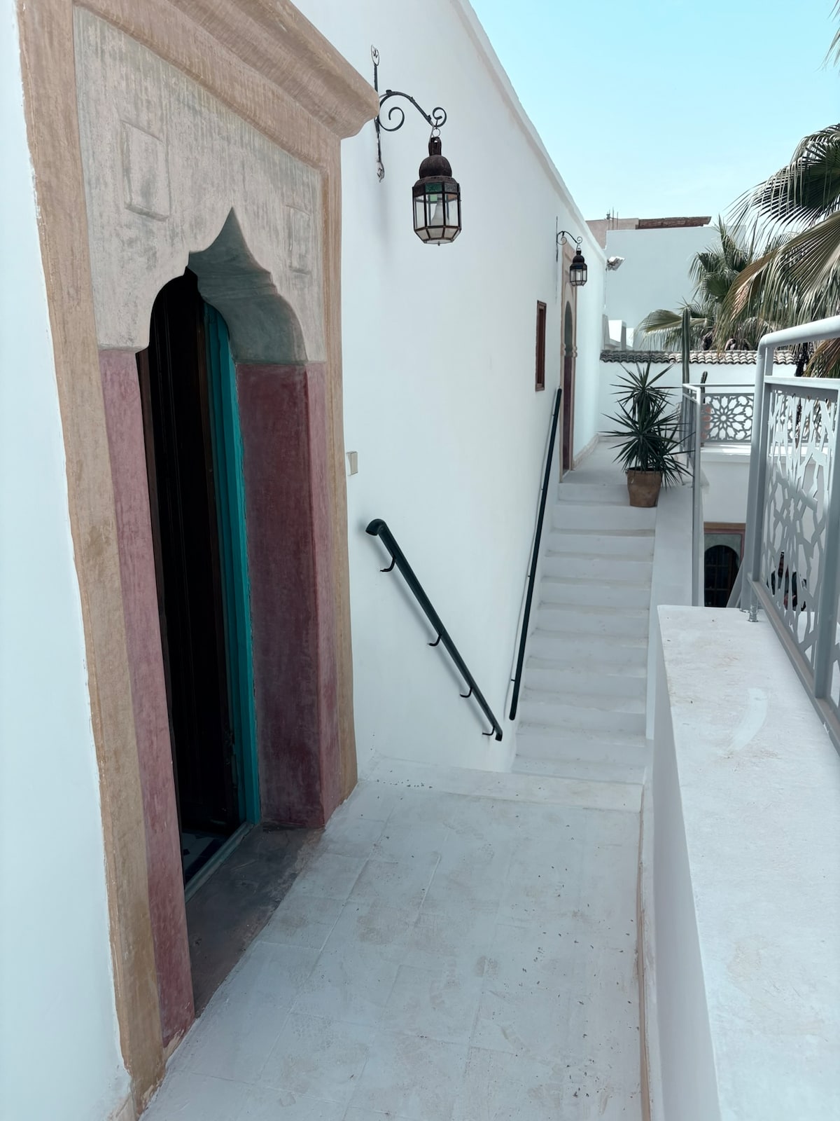 A spacious 55m² Moroccan-style apartment with large windows offering a beautiful ocean view. It features a double bed, salon with large sofa, TV, fully equipped kitchen, private bathroom with shower, good Wi-Fi high speed, a work desk, and a small fridge. Perfect for couples, families, and surfers. Ideal place to enjoy your vacation while working remotely. Breakfast (included in the price) is served on the rooftop terrace, the perfect spot to start your day with a beautiful ocean view.