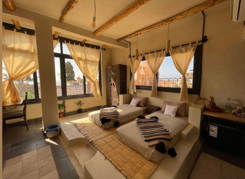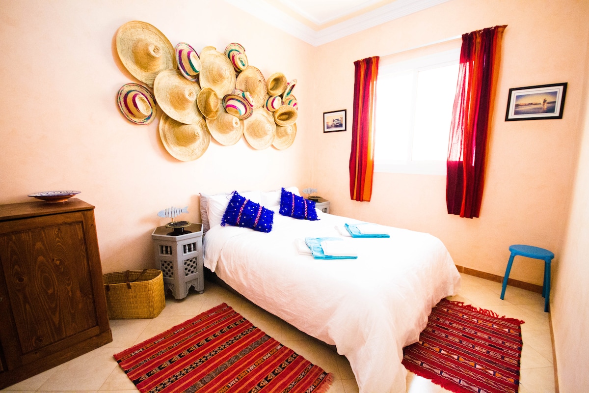 Welcome to your slice of authentic Morocco - where traditional charm meets surfer's paradise! 🏄♂️ Our highly-rated beachside suite offers the perfect blend of local style and modern comfort. 🏠 Your Private Space: • 2 comfortable bedrooms • Traditional Moroccan salon with Smart TV • Full private bathroom • Fast WiFi (108 Mbps) 🌅 Shared Rooftop Paradise: • Fully equipped kitchen for guest use • Stunning ocean & mountain views • Relaxing terrace seating • Perfect spot for sunset watching