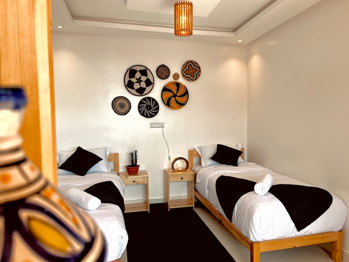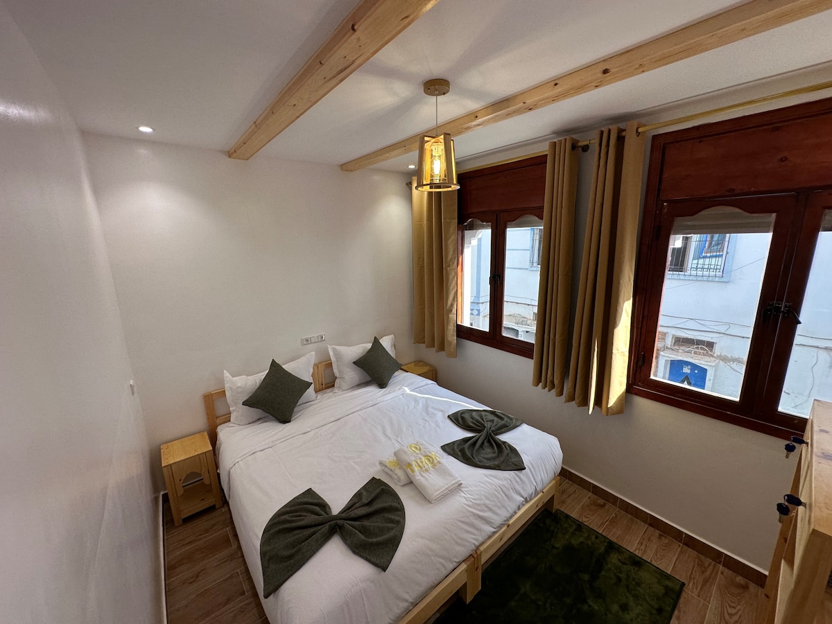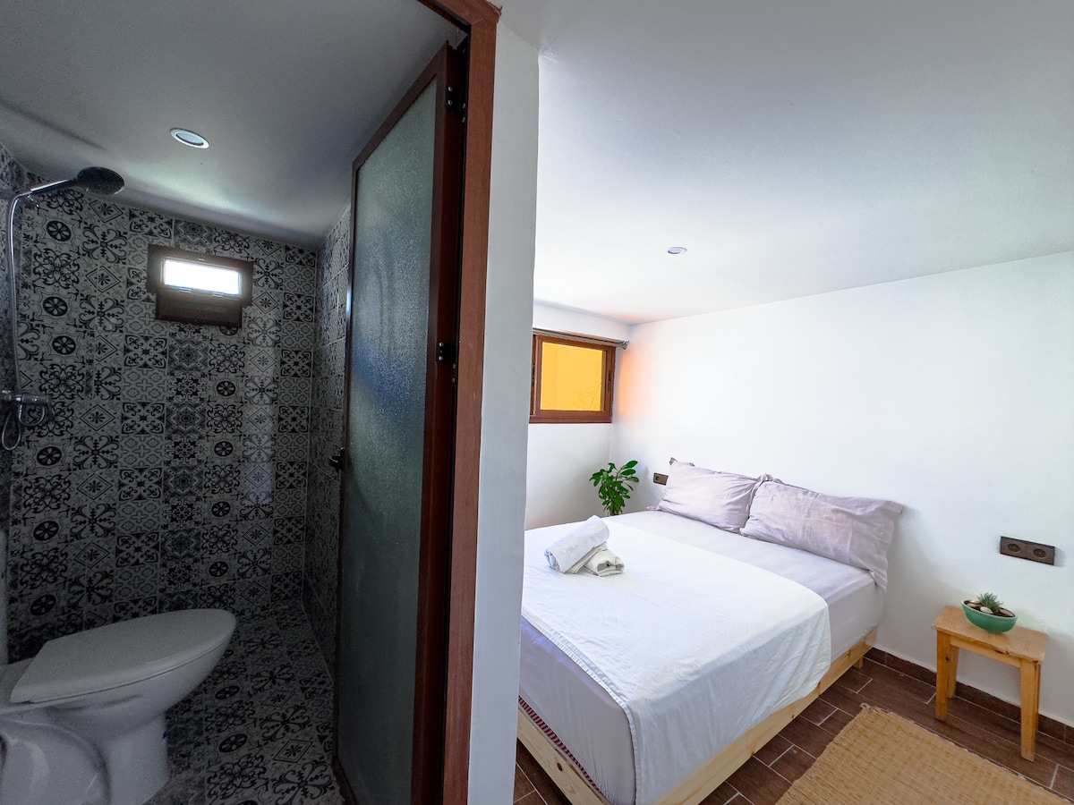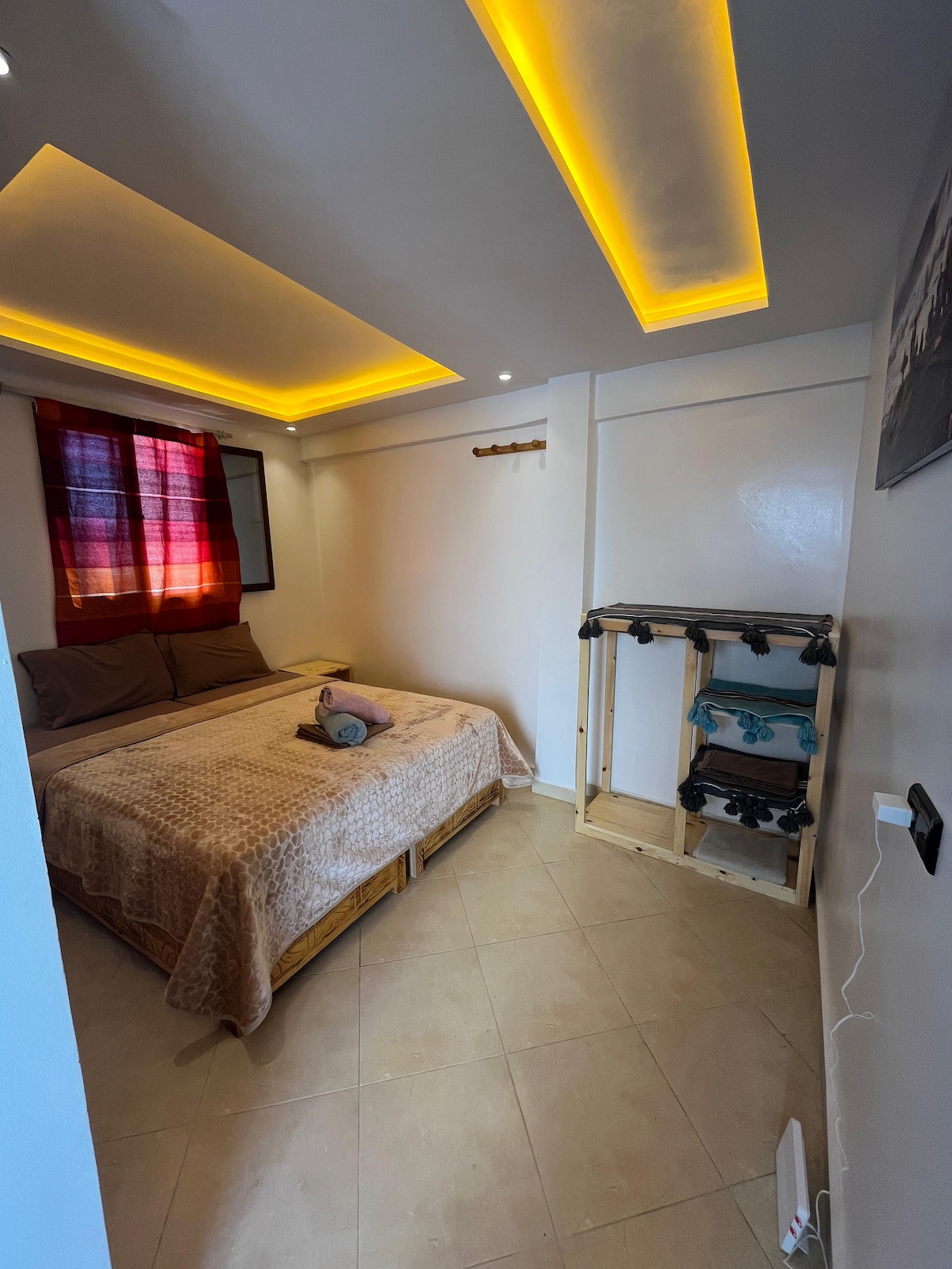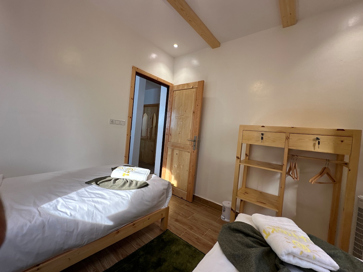 A comfortable room in the charming village of Taghazout, equipped with two single beds that can be converted into a double bed, ideal for couples. The room includes a private bathroom with a modern shower, a bright window providing beautiful natural light, a spacious wardrobe, and a clothes rack. Towels are provided for your comfort. NOTE : WZ DO NOT ACCEPT NO MARRIED MOROCCAN COUPLES. .