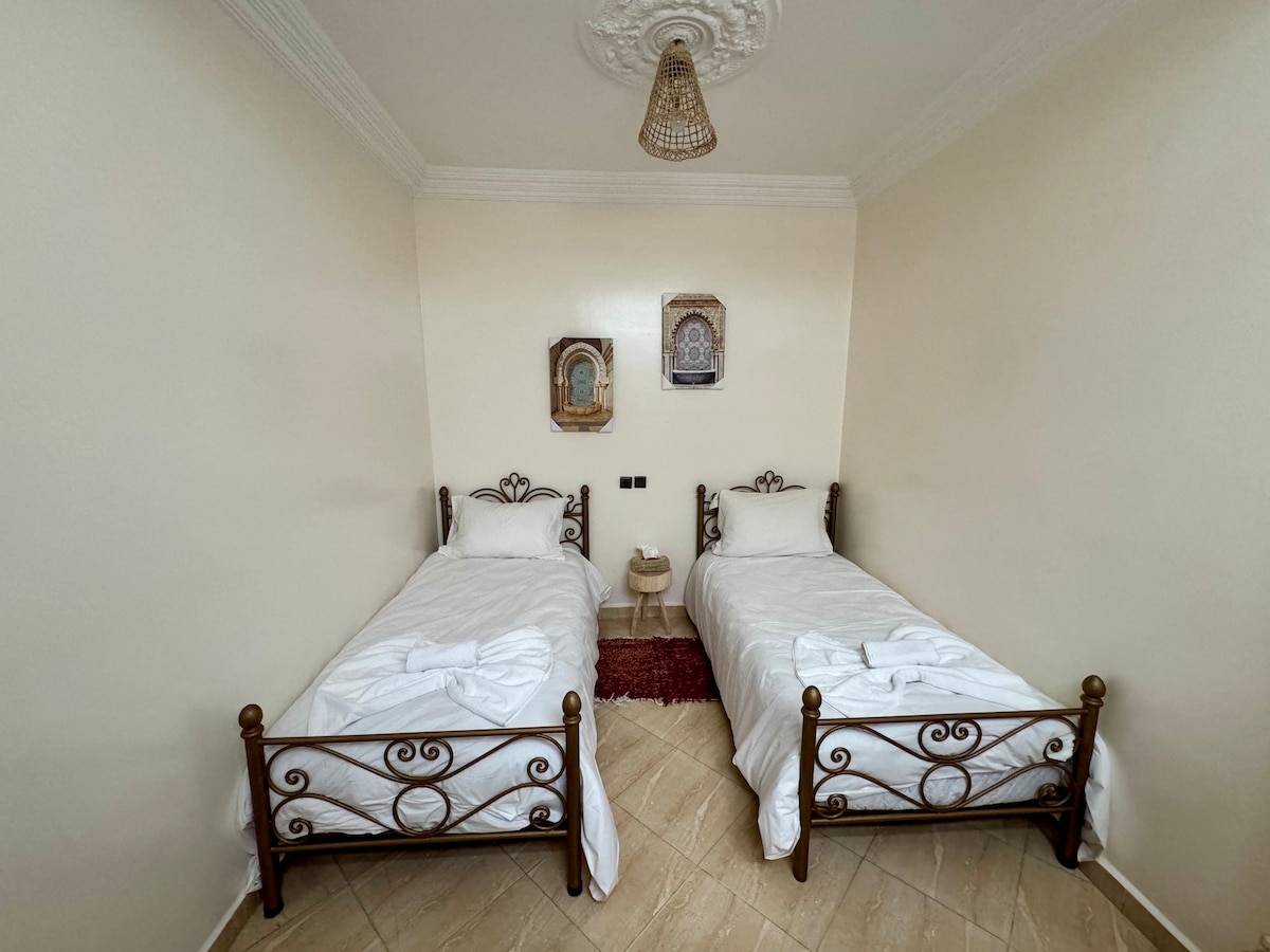 Cozy twin room inspired by the traditional charm of Fez, offering a peaceful and bright space to relax after a surf day. Located on the second floor of Nomazigh Surf House, guests can enjoy access to the chill terrace, co-working area and a rooftop with ocean view. Just a short walk to local bakery (1 min), Happy Tamraght restaurant (2 min), and Manzili Co-working (4 min). Close to popular surf spots like Devil’s Rock and Banana Point.