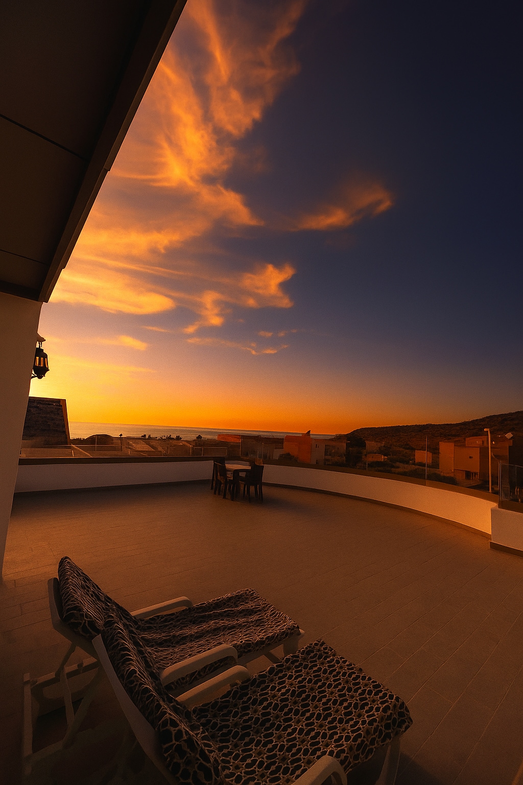 Luxurious penthouse with panoramic views of the Atlantic Ocean in the heart of Taghazout. Unique and sophisticated house, with attention to detail, from fine materials to designer furniture. The house has 4 bedrooms, two with double beds, one with en suite bathroom, a bedroom with two single beds and a spacious single room. Large living room with windows overlooking the ocean, an equipped kitchen overlooking the sea and a terrace with sofas, dining table and Barbeque. Hotel service on request.