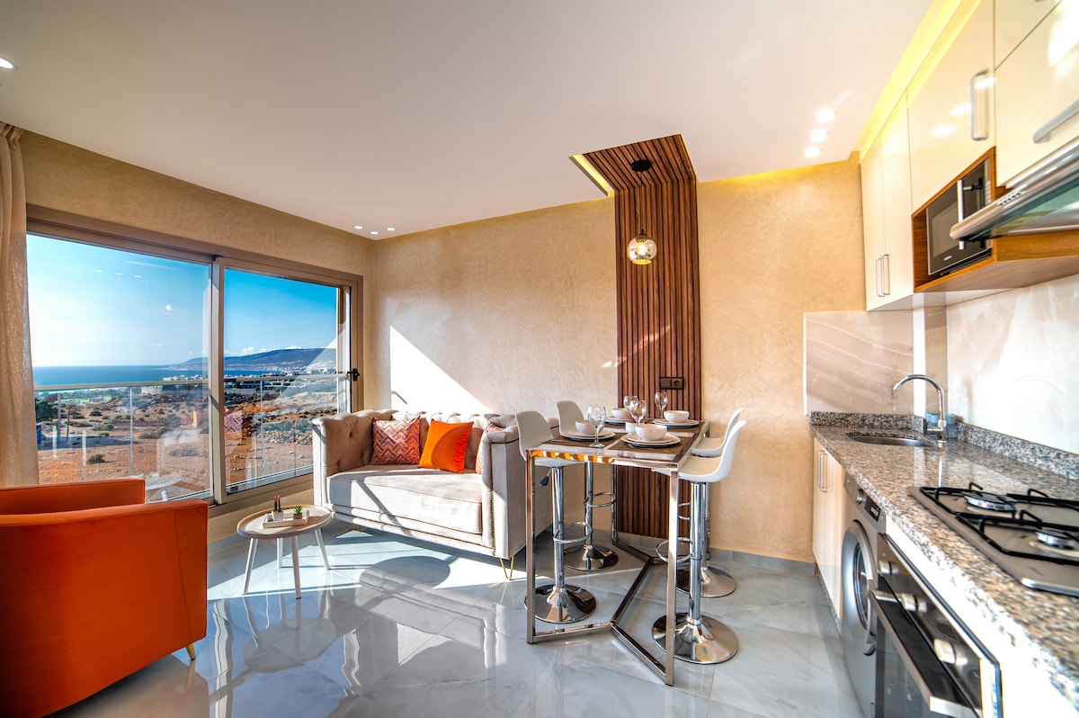 Enjoy a bright and cozy one-bedroom apartment with panoramic ocean and sunset views, located in the heart of Taghazout Bay. Perfect for couples, surfers, digital nomads or anyone looking for peace, comfort and quality time. • Ocean & sunset view from the balcony • 5 minutes walk to the beach • Pool, playground & football field inside the residence • Fast Wi-Fi • Secure gated community with 24/7 security You will enjoy the perfect mix between calm, ocean vibes, surf energy and comfort.