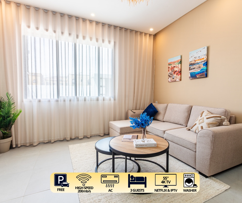 À 400 m de la plage de Taghazout, profitez d’un appartement cosy 2 chambre avec vue mer et couchers de soleil inoubliables. Résidence calme et sécurisée, idéale pour se détendre après une journée de surf ou d’excursion. Intérieur lumineux avec cuisine équipée, wifi rapide fibre optique et salon confortable. Cafés et restaurants typiques à deux pas. L’endroit parfait pour savourer l’esprit océan et la douceur marocaine.