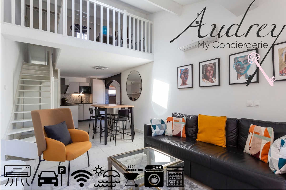 A family haven on the beach, 54m2, bright and air-conditioned. This house is perfect for a relaxing or professional stay. Completely renovated and tastefully furnished, it sleeps 4. Hotel-quality sheets and towels, fully equipped and functional, all you have to do is put your suitcases down. Linen, TV-Wifi box and closed parking included.