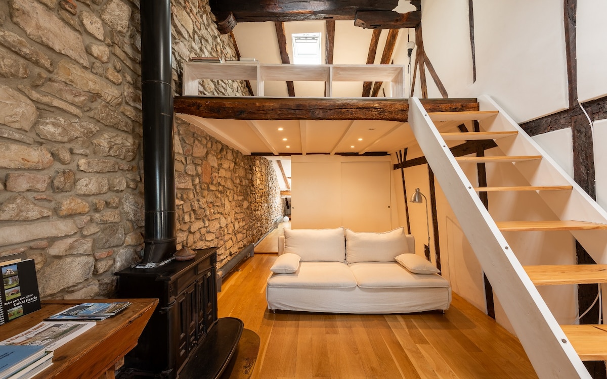 Precioso apartamento tipo loft y recién reformado. Ideal para una pareja que busque relajarse unos días en un espacio muy acogedor y decorado para que los huéspedes tengan una estancia inolvidable de relax y descanso en la campiña de Hondarribia. Un entorno muy tranquilo a diez minutos andando de la Marina (centro) y a 5 minutos andando de la playa. Terraza privada de 20m2. Cama de 150. Chimenea. Sofá cama. Ducha efecto lluvia... Aparcamiento gratuito Servicio gratuito de bicis. Piscina