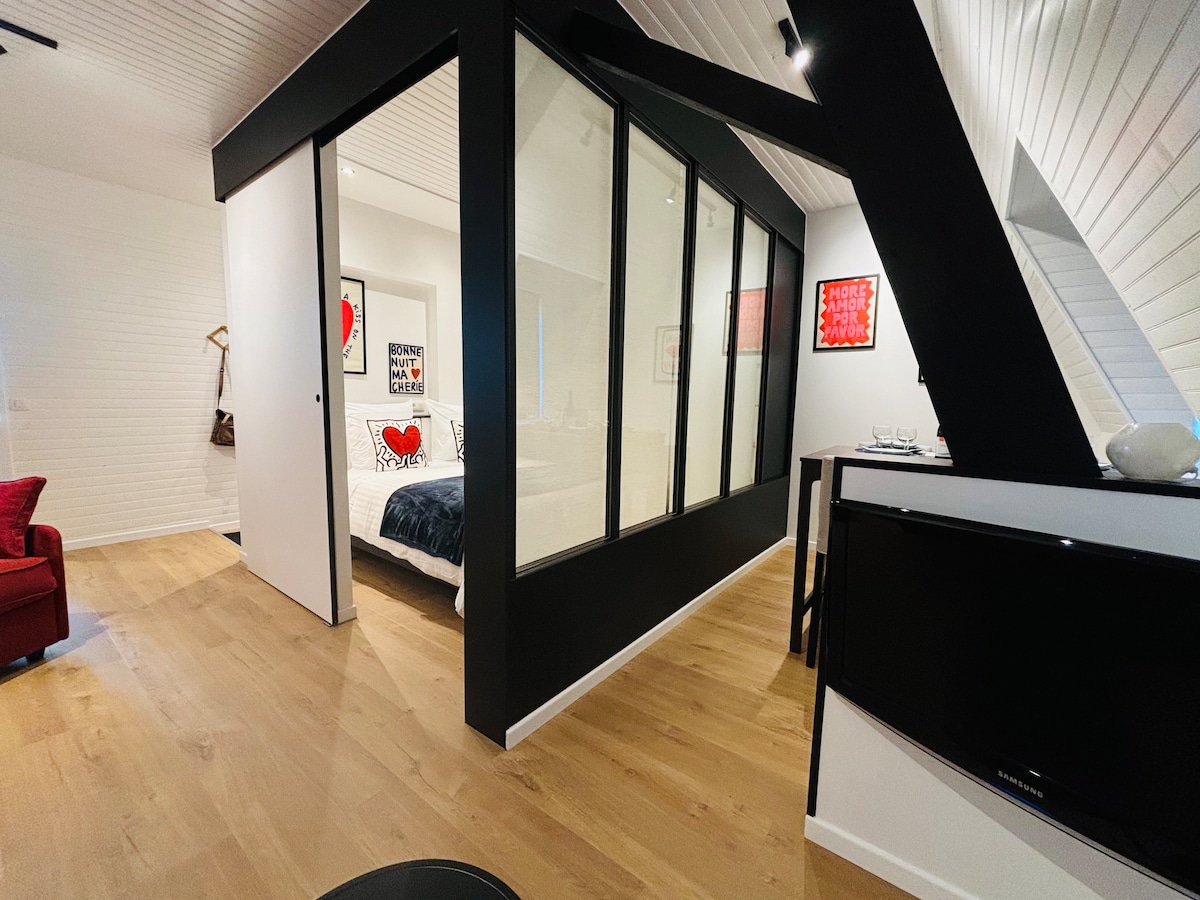 A small love nest in the heart of St-Valery-sur-Somme, the Somme’s bay welcomes couples for a moment of relaxation and peace thanks to its Spa area and a bedroom with a king-size bed. Warmly welcomed , bathrobes and cozy towels will accompany you in the spa area, equipped with a large jacuzzi with 2 massage areas, a Finnish sauna and two separate showers. And more a quality sound system and chromotherapy for the pleasure of the senses.