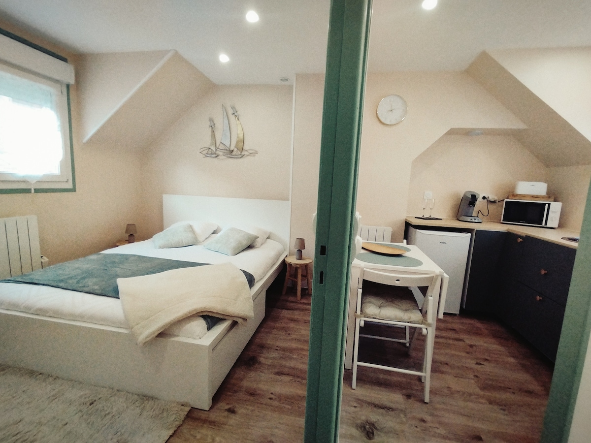 ATTENTION ÉCHAFAUDAGE PREVU DU 25/05 au 12/06/2026 - BAISSE DU TARIF DURANT CETTE PERIODE WIFI disponible - Uniquement pour 2 adultes Arrivée autonome - Tout est prêt à votre arrivée, le lit est fait, le linge de toilette est également fourni. Stationnement gratuit à proximité. Véritable nid douillet pour 2, est idéalement situé à quelques pas de la plage, offrant une vue imprenable sur la mer.