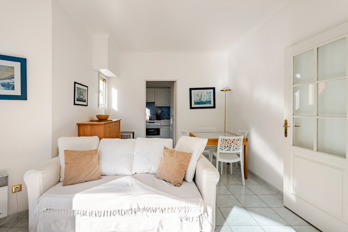bilocale white and light blue, is full of light!Come stay in our Charming, Brightly Lit One Bedroom apartment in Saint Jean Cap Ferratvery nearby Italy. Be awakened by the sound of birds and the bright Mediterranean sunlight before stepping outside to the many local cafes and restaurants in the town directly outside, or to the first of many beaches just five minutes away on foot, or the footpaths that lead you for a delightful walk around the peninsula. This beautiful, recent apartment is graced with a off the comfortable living room, many windows to enjoy the summer breeze and incomparable light of the Côte d'Azur, windowed kitchen with electric stove and range, a bedroom where you will sleep under a fresco and enjoy the cross-currents of breeze allowed by the windowin the room The bathroom, has a full-sized tub with hand shower, and the apartment is equipped with a washer. We are in a small building, up one flight of stairs elevator. When you open the door, we invite you to share our home and delight in the many joys and pleasures of living here in the South of France! ***Please note, this is a NO SMOKING apartment. Absolutely none! *** Puo' ospitare comodamente 2 persone, ha una cucina moderna ma romantica perfettamente attrezzata, plus a washmachine. Nel centro della penisola del posto piu' bello del mondo,si possono raggiungere a piedi 4 spiagge diverse, ristoranti supermarket,port.