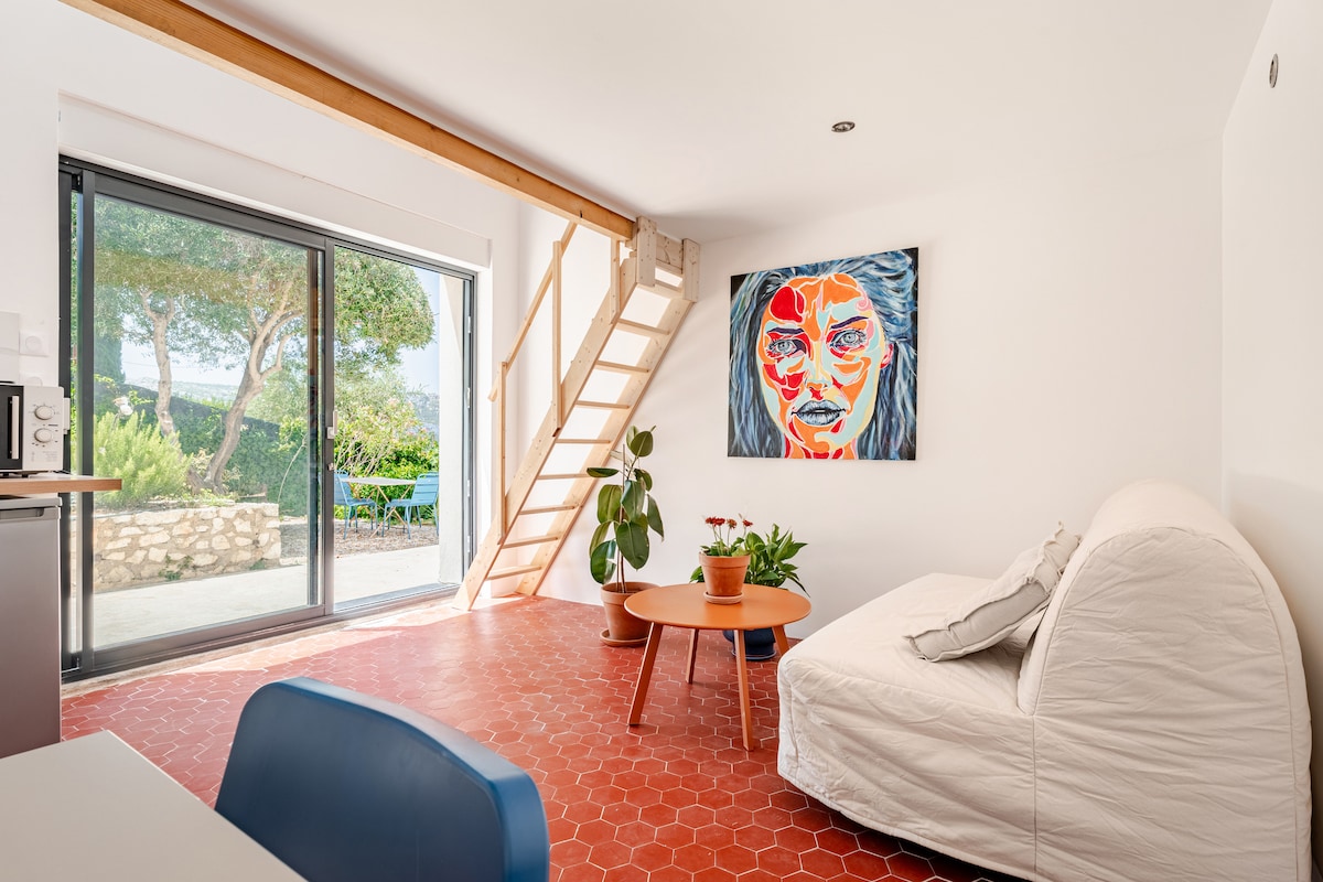 → Terrace with panoramic sea view → Renovated by a well-known architect → Modernly equipped : air conditioning in every room, fully-equipped kitchen → 3 bedrooms with queen-size beds (160 cm x 200 cm) and 3 bathrooms → Sauna and spa → Located 10 minutes from the calanques → 3 minutes from hiking trailheads → Direct access to the beach → No overlooking neighbors, very quiet → Bus just a short walk away → Private parking available next to the house