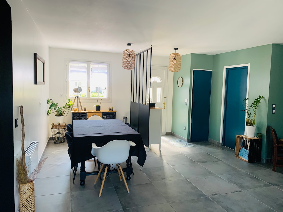 La maison a été entièrement refaite en 2018. Elle se compose d'un vaste séjour + cuisine avec cheminée en insert. La cuisine est totalement équipée : four, plaques, réfrigérateur, congélateur, micro-ondes, lave-vaisselle, Nespresso, bouilloire. A l'étage, une grande chambre avec rangements et une seconde chambre avec lits en mezzanine. Canapé lit dans le séjour. Portail automatique permettant de rentrer son véhicule dans le jardin.vfgefevlr. Ev est