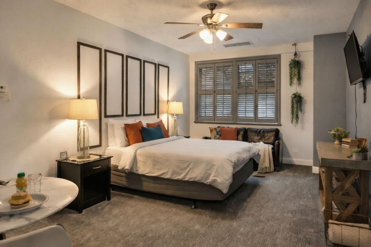 Easily access local hot spots from this hip Studio. Hop on the complimentary bikes and browse the boutique shops and art galleries in the heart of NuLu Stellar Suites is a Boutique Hotel steps away from best restaurants, local boutiques, galleries and nightlife. This modern loft has a great view of bustling Market streets and activities, and it’s the perfect place to relax after a long, fun-filled day. Walkable score of 90!