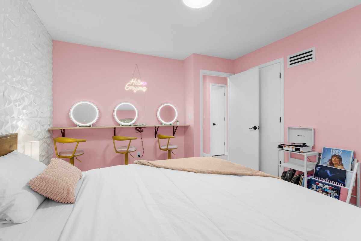 粉红色房间,带热水浴缸、游戏室和疯狂的双层床!