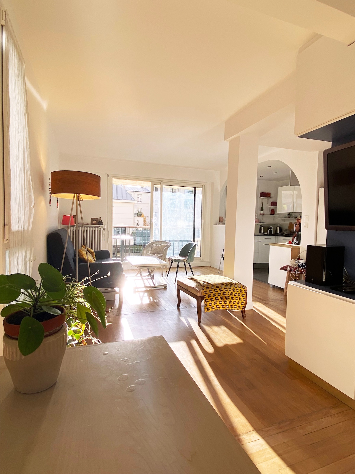 Quiet traditional Parisian apartment in a 19th Century dressed stone building and street on 5th floor with elevator : double living room, bedroom, fully equipped kitchen (dish washer and washing machine/dryer), balcony and private underground parkplace (4 minutes on foot). I furnished and decorated it with love, including paintings. In a neighbourhood vibrant of shops and restaurants, it is 2 minutes on foot from the Metro, from which all Paris must-sees are within a 13-30 minute range.