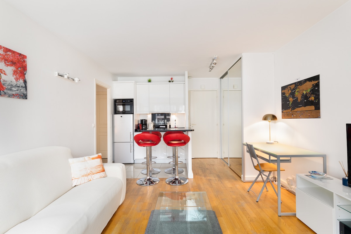 Quiet traditional Parisian apartment in a 19th Century dressed stone building and street on 5th floor with elevator : double living room, bedroom, fully equipped kitchen (dish washer and washing machine/dryer), balcony and private underground parkplace (4 minutes on foot). I furnished and decorated it with love, including paintings. In a neighbourhood vibrant of shops and restaurants, it is 2 minutes on foot from the Metro, from which all Paris must-sees are within a 13-30 minute range.