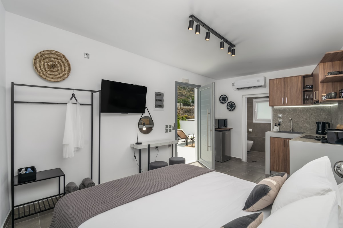 Experience summer bliss with sea and sunset views from your balcony in our superior double! Conveniently located 7 minutes by foot from the capital, Plaka, and within 5 - 10 minutes by vehicle from gems like Sarakiniko , Fyropotamos , Mandrakia, the port of Adamas and many more. Room includes private bedroom, bathroom and balcony, mixing cycladic and modern style. Εquipped with free WiFi, A/C, fridge, coffee machine, a flatscreen TV and free private parking at the property.