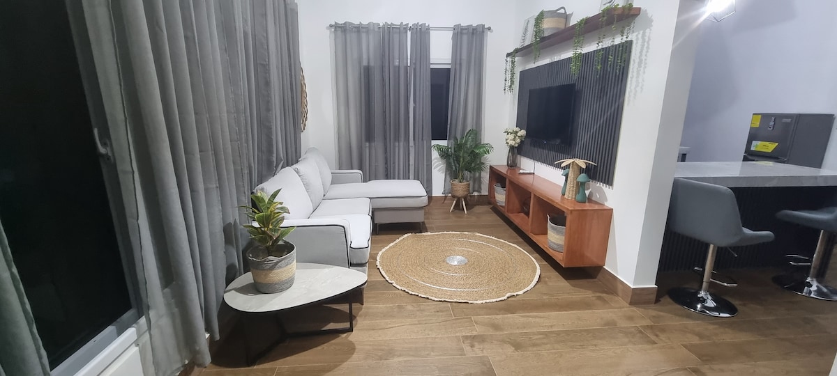 Disfruta de una estancia única en este moderno apartamento con acabados de lujo, diseñado para brindar comodidad, elegancia y una experiencia inolvidable. Perfecto para familias, parejas o viajes de negocios. Excelente Ubicacion a solo 3 minutos de la playa de TelaMar, cuenta con piscina compartida para todo el complejo, ubicado en la avenida principal donde esta el aeropuerto cerca de restaurantes, minisuper y tiendas de conveniencia.
