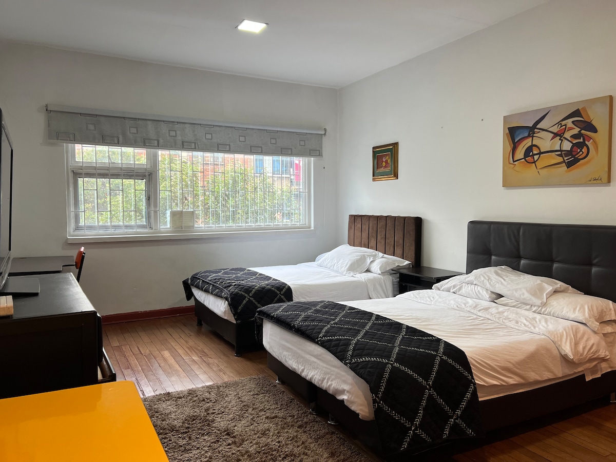 ✨ Welcome to your perfect retreat in Bogotá! Ideal for couples or groups of up to four, our beautiful apartment offers comfort and style in every detail. Enjoy two bedrooms, a living room with TV and desk, a fully equipped kitchen, and two modern bathrooms. Plus, take advantage of the building’s amenities: a terrace with panoramic city views, coworking space, laundry facilities, and a fully equipped gym to keep up with your routine. 🌇 Book now and experience a unique stay in Bogotá!
