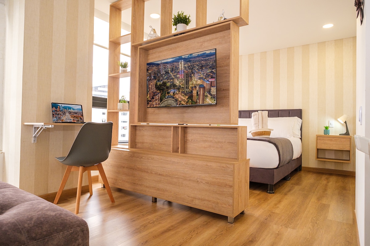 Recently renovated charming Studio. This place is strategically located: close to markets, museums, San Martin Mall, Monserrate, La Candelaria, La Plaza del Perseverancia, la Calle Bonita, National Park International Center (Financial zone), and countless restaurants, bars, and cultural activities that will make your visit to the city, an unforgettable experience. The building has a gym, coworking, pool area, and BBQ terrace on the top floor 360 View.