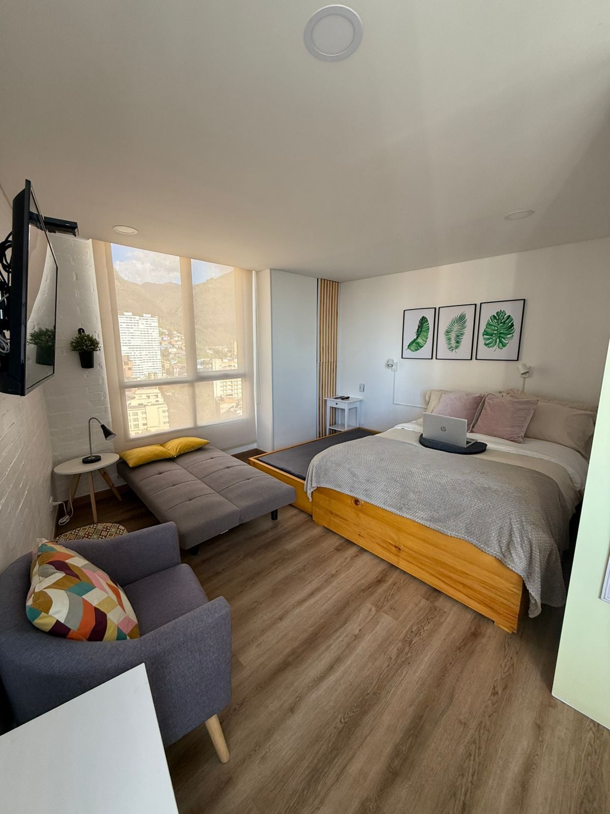 Stunning loft with breathtaking city & mountain views. Indulge in the most luxurious bed in the building, providing a level of comfort akin to a five-star hotel. Plush pillows ensuring the best sleep of your life. Enjoy a 60" TV with Netflix, a well-equipped kitchen, and relax in the easy chair by the window. Hot water shower, Hairdryer, ample closet space, and a perfect work area. Upcoming amenities: rooftop, coworking, gym. Close to Transmilenio station. Book now for an unforgettable stay