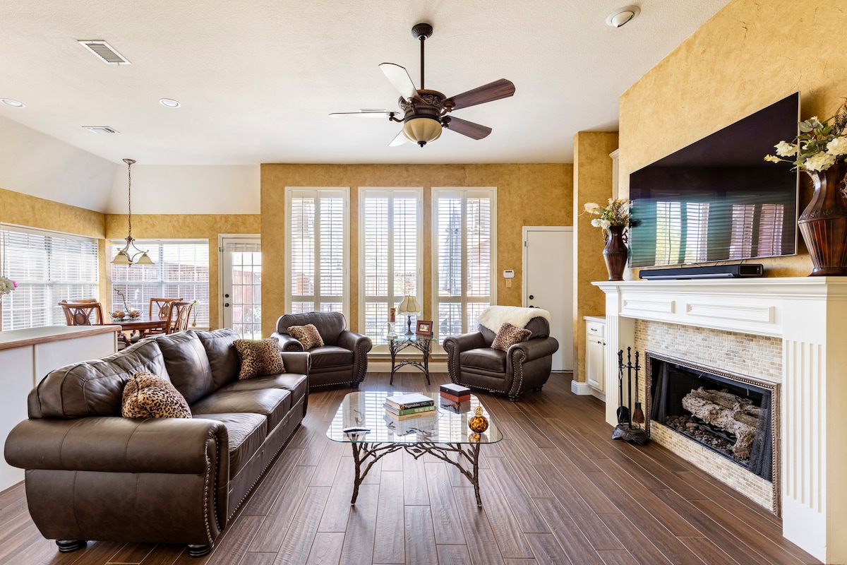Welcome to our luxurious family-friendly Airbnb! Our home has all the amenities you need for a comfortable and enjoyable getaway with your loved ones. Watch movies and TV shows on the huge 85-inch screen, relax in the hot tub, or play in the grassy backyard. We even have a cozy reading nook for quiet moments. Located near Legacy West, The Star, RoughRiders Baseball, and many shopping malls, you'll never run out of things to do. Book your stay today and start planning the ultimate vacation!