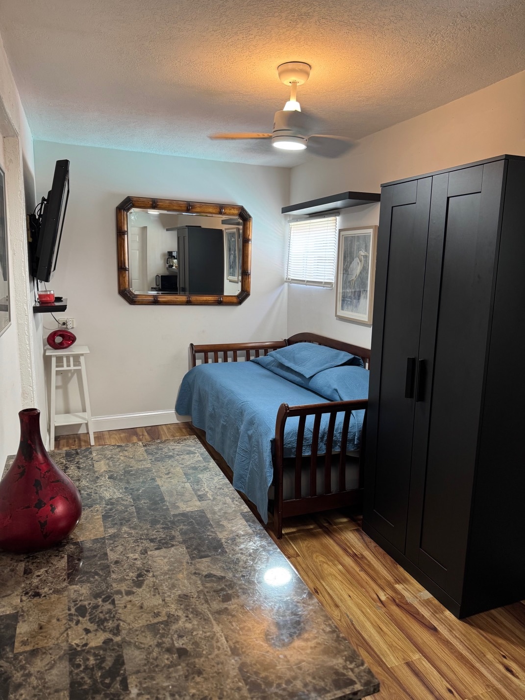 Unwind at our quiet studio after enjoying the day/night out exploring South Florida's beautiful beaches, shopping at the biggest outlets, or trying your luck at the casinos nearby. The studio's independent entrance allows for a hassle-free stay, with convenient parking spot a few feet away. The bedroom has one comfortable queen-sized bed, and the bathroom has built-in bluetooth speakers. ↳ 17 minutes from Sawgrass Mall ↳ 16 minutes from Fort Lauderdale Airport ↳ 35 minutes from Miami Airport