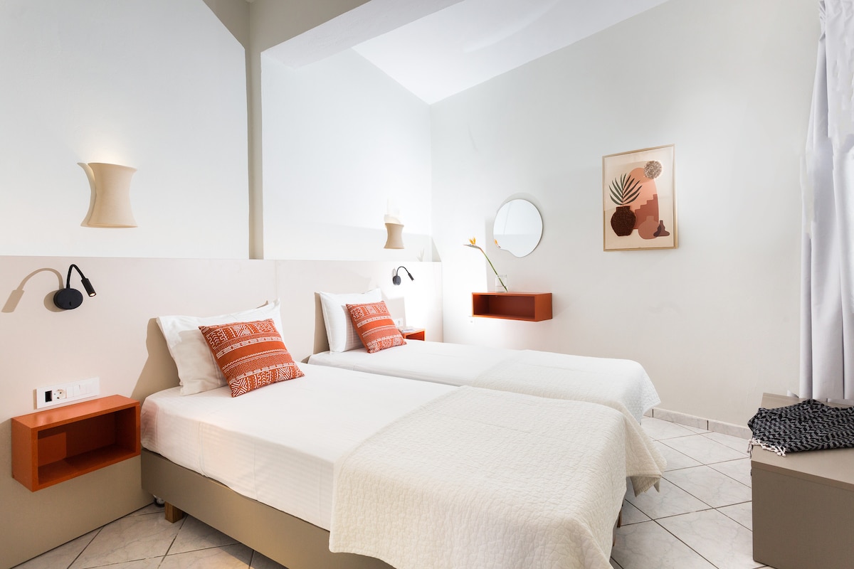 Stay with your whole family or group of friends in this wonderful accommodation and enjoy moments of joy and relaxation. It can host up to eight guests, featuring two bedrooms and two loft-style rooms. Just a 5-minute walk from the beach of Platanias and with easy access to restaurants, cafés, supermarkets, and shops in the heart of the tourist resort of Platanias. Everything you need for your stay is provided—towels, bed linen, shower gel, shampoo, and more.