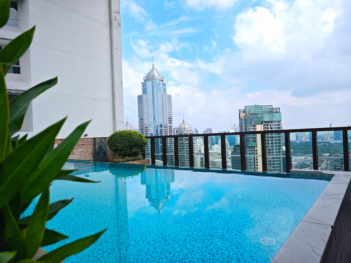** Free Early Check-in and Late Checkout! ** Modern 1BR apartment on the 21st floor with stunning Bangkok skyline views. Located in a luxury building with high security, and full in-room amenities: hi-speed Wi-Fi, smart TV, washer/dryer. Easy access to BTS, taxis, and public transport. Pool, sauna, and gym facilities are available for long-stay guests only, as per building policy.