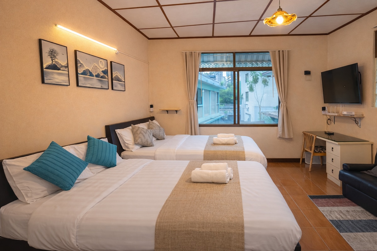 🏡Step into a Renovated Designer Loft that blends industrial charm with warm modern comfort, perfectly located just 1 minute from BTS Ratchathewi and 5 minutes from Siam, MBK 🏡This spacious 50 sqm studio features exposed brick walls, and 2 queen-size beds for up to 4 guests. Relax in the cozy lounge area, enjoy Netflix on your Smart TV 🏡 Designed for families, couples, and groups, this loft delivers comfort with home-like warmth — a true Bangkok retreat where design meets location