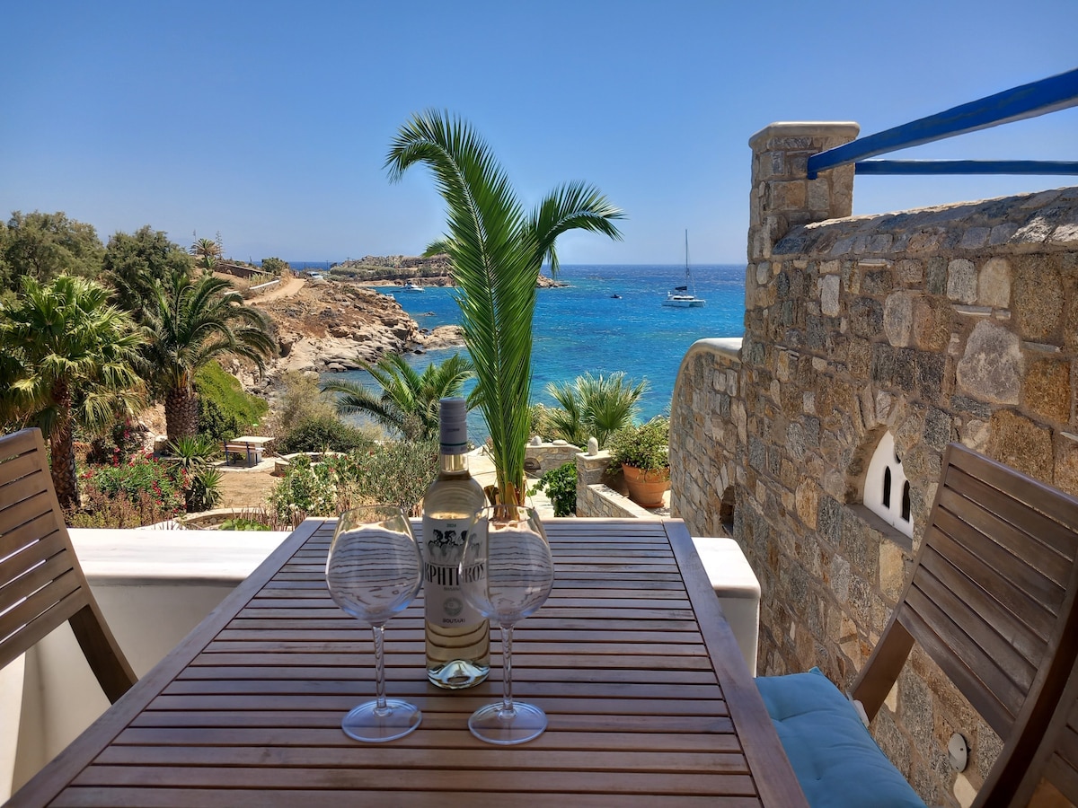It's a traditional cycladic house of 60 square meters with a kitchen, bathroom, 2 couches and a big kig size bed that can be converted in 2 single beds. The house has private access and also a sea view of the little hidden beach with direct access to the beach.