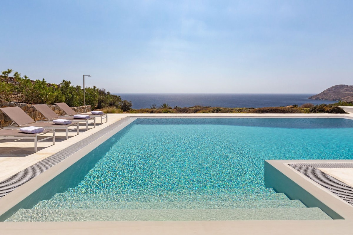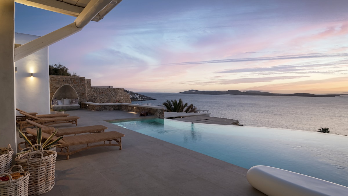 Designed by the Spanish architect Javier Barba, the villa balances ancient Cycladic principles with contemporary artistry (such as the beautifully wrought entry gate by Alekos Fasianos). Multiple outdoor living and dining areas include a pergola-shaded terrace with lounge, bar, and dining table. Down below, the ample pool terrace yields to a bistro-style observation deck. The vistas encompass the islands of Delos and Paros, as well as an antique church nearby.