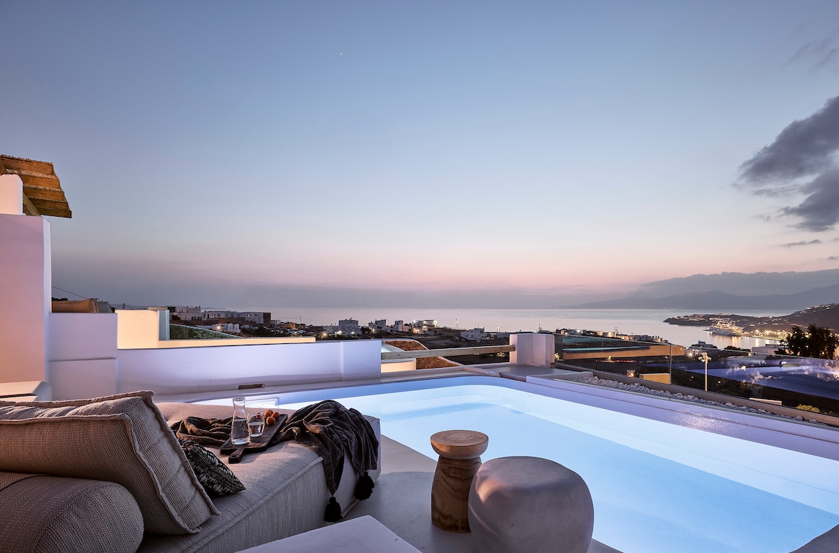 Mykonos Divino wave style is an apartment with private pool at Mykonos Divino complex. There is one united space with a double bed, sofa and kitchen. Wave style private infinity pool with great views to old town and Aegean sea.