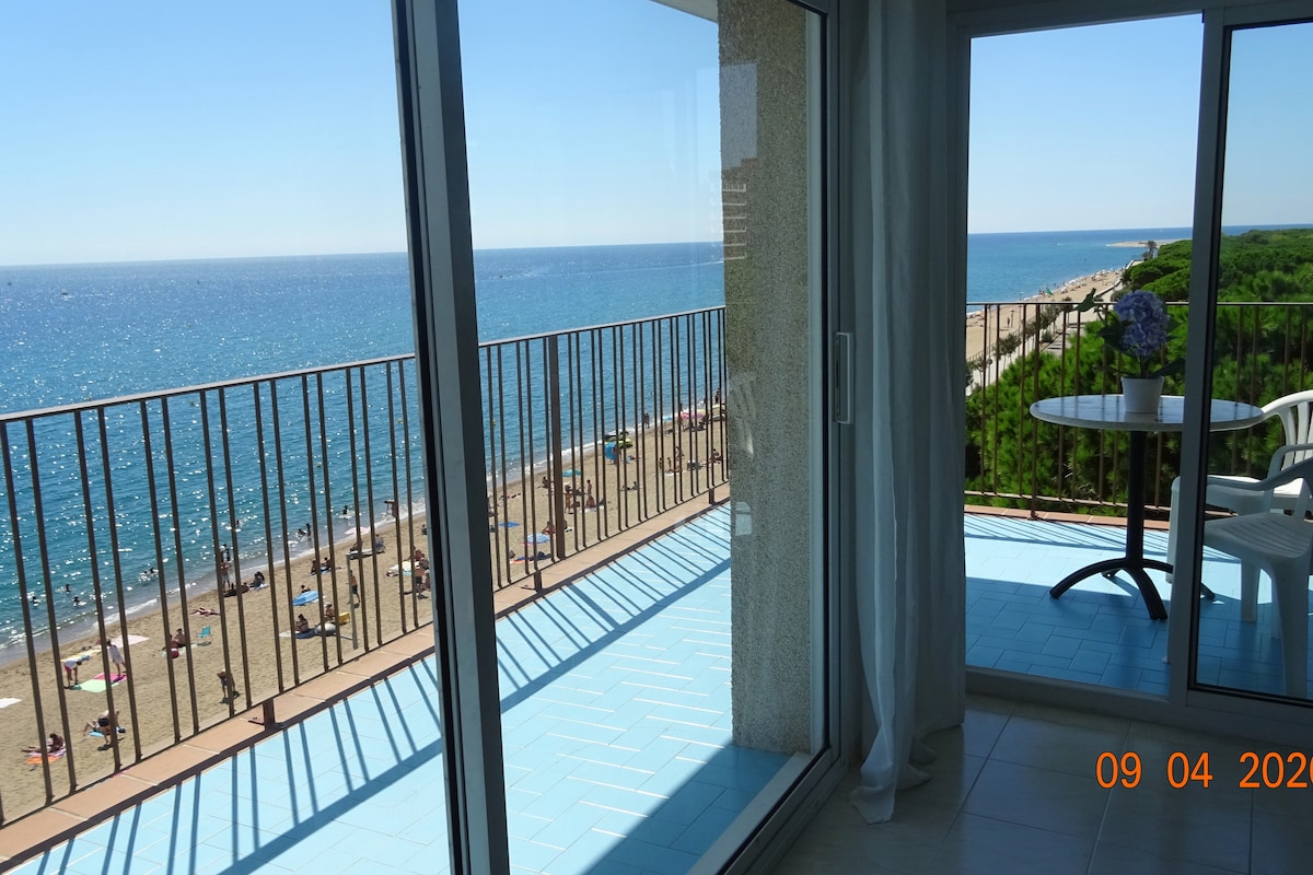 Gran apartamento de 110 m., junto al mar, en la misma playa, ,gran terraza y PARKING privado. Vistas espectaculares (comedor todo vidrieras) y 2 PISCINAS (horario 10 a 23,jun/sep) con zona ajardinada (muy cuidada), 3 habitaciones orientadas al mar y gran zona ajardinada. Dos baños completos con bañera. A 45 min. de Barcelona y 30 del aeropuerto de Girona. Muy bien equipado ,con aire acondicionado y calefacción. Jardines y parque infantil al lado de la finca.