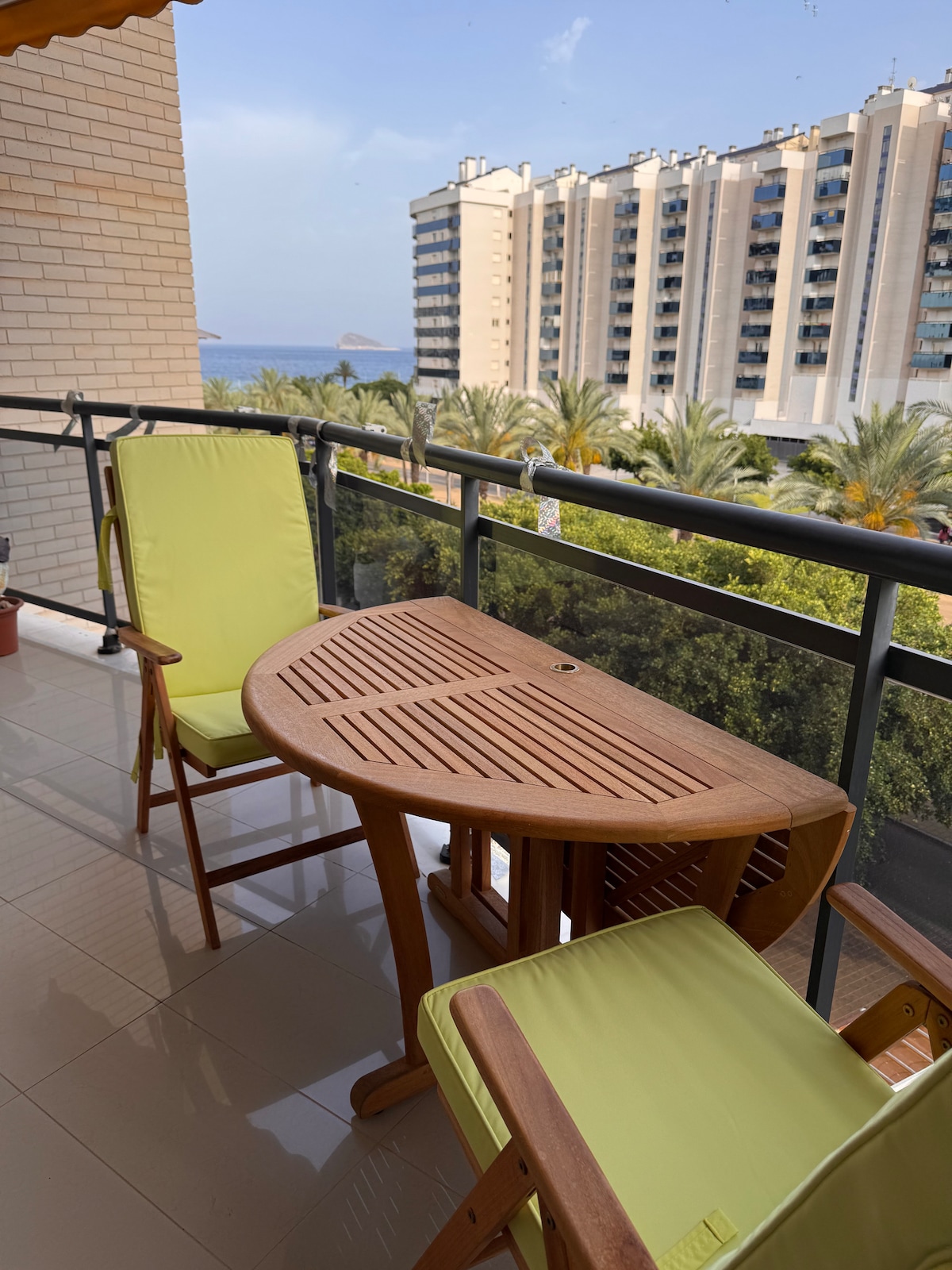 Apartamento de 2 habitaciones para 4 personas en primera línea de la playa Poniente, con vistas de la playa y el mar, terraza grande con vistas, todo exterior, salon amplio con vistas al mar, aparcamiento privado, wifi, TV, aire acondicionado, cocina completa (lavavajillas, lavadora, horno), baño completo, en urbanización con piscina, jardín muy bonito con vistas al mar y pista de tenis. La urbanización tiene acceso directo al paseo maritimo y es una de las más bonitas de la playa de Poniente.