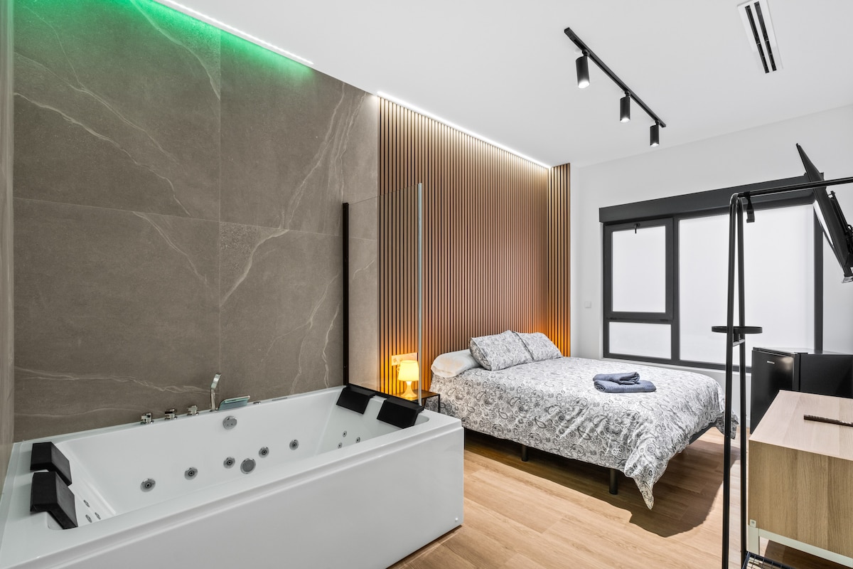 Apartamento con hidromasaje para dos personas. Alójate en un edificio con historia en la ciudad de Alicante. Personalidad y confort se reflejan en cada rincón de este lujoso apartamento pensado para disfrutar de unos días inolvidables junto a tu persona favorita. Equipamiento completo, bañera de hidromasaje y piscina. Todo en pleno centro de la ciudad, a 500 metros de la estación de tren y principal zona comercial de la ciudad y a 2 km de la Playa del Postiguet. Reg. de Turismo CV: AA-743