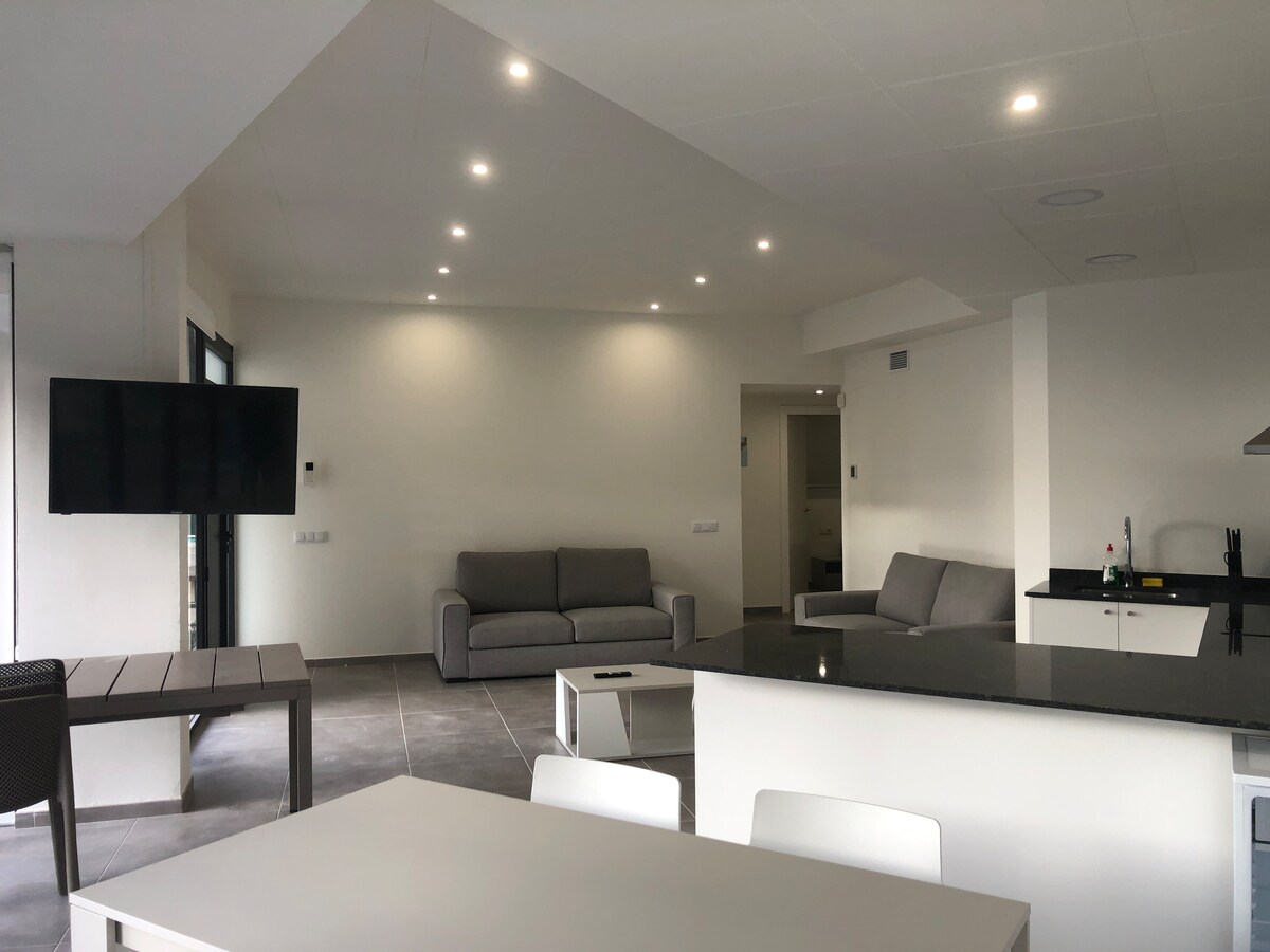 Piso de 2 habitaciones, 3 piscinas comunitarias y parking incluido. Habitación principal con cama doble y salida a terraza. La otra habitación tiene 1 litera y cama individual. Terraza con mesa, sillas reclinables y vistas al jardín y las piscinas ( solo en temporada de verano, de final de Junio a final de setiembre) . Con la cocina nueva y equipada. Televisión 65” Phillips Ambilight en sala de estar. Dispone de ropa de cama y toallas. Cafè dolce gusto gratuito!
