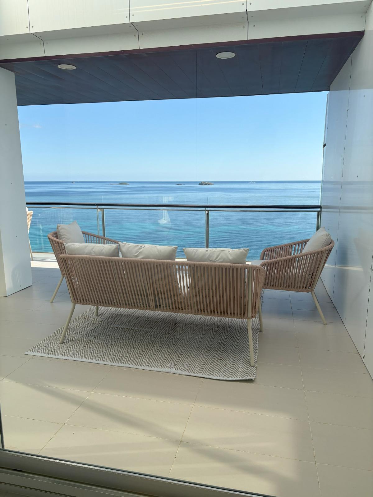 Magnifico piso en urbanización con piscina y con salida directa al paseo marítimo de la playa de Santa Eulalia. Piso con salón-comedor con cocina incorporada y salida a terraza, 3 habitaciones y 2 baños. En la parte de arriba una terraza propiedad del alojamiento y de uso exclusivo de 100 m. con espectaculares vistas, barbacoa, pérgola, mesa y tumbonas. La vivienda cuenta con calefacción y aire acondicionado. Se encuentra totalmente equipada con toallas y sabanas y menaje de primera calidad.