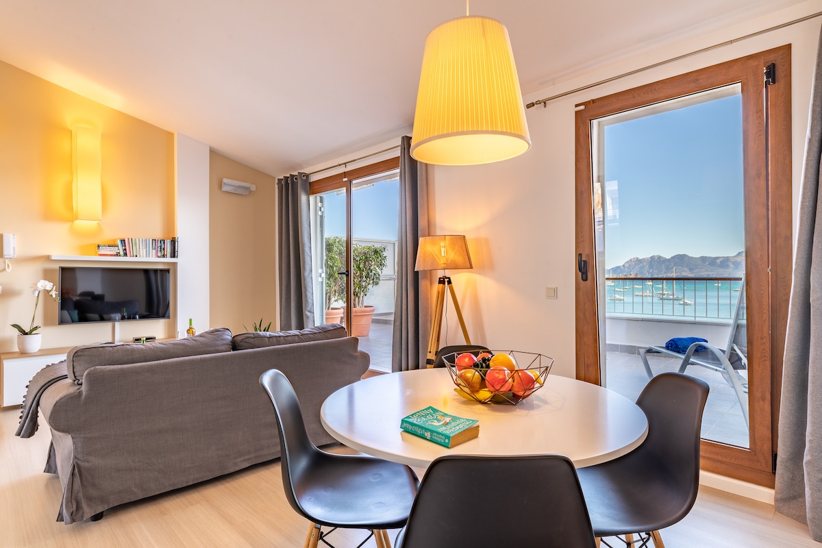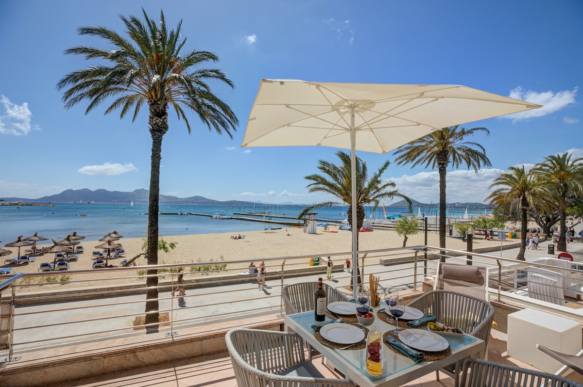 Apartamento Totalmente renovado de 3 habitaciones, 2 baños (1 en suite ). Primera linea de playa con excelentes vistas de toda la bahia de Pollensa. Terraza privada con sofas, mesa para comer y hamacas para tomar el sol. Ideal vacaciones o teletrabajo. Zona perfecta para hacer deporte, carril para bicicletas y caminantes. 20 minutos a pie del centro del Puerto. No incluido Impuesto al turismo de Baleares. Mayo-Oct: 2,20 €/noche/adulto. (16 años o más) Nov-Abril : 1,65€/noche/adult.
