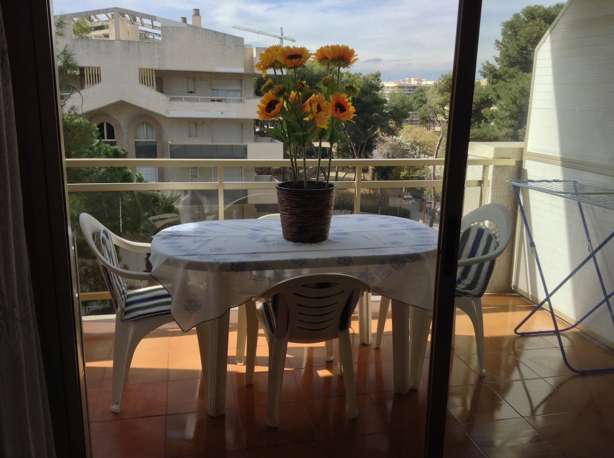 Apartamento para 6 personas a 5 min de Portaventura en coche y a 400m de la playa andando, dispone de dos habitaciones, una matrimonial con armario empotrado, y otra tipo camarote con un sofá cama, salón-comedor amplio con otro sofa cama, smart tv, WIFI, AIRE ACONDICIONADO, lavadora, plancha , cocina y baño completos, balcón con sofá chill-out, espacioso y soleado con bonitas vistas.Dos piscinas, parque infantil, jardines, mini golf, ping-pong, pista de basquet, futbol y frontón.
