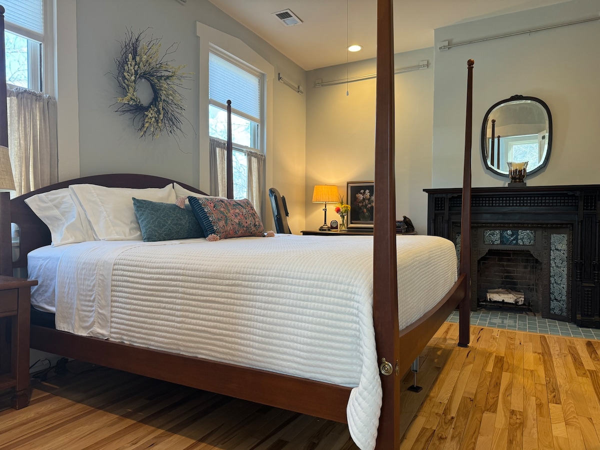 The Captain suite is one of 3 suites offered in this 1845 historic Antebellum home. This private suite is just off the second story Grand Hall room and features a king bed with luxury bedding, antique desk, and early American pecan furnishings. The 11 ft ceilings, tall windows, and ornate antique fireplace add charm to this lovely room. The updated on-suite bathroom is adorned with marble flooring and shower.