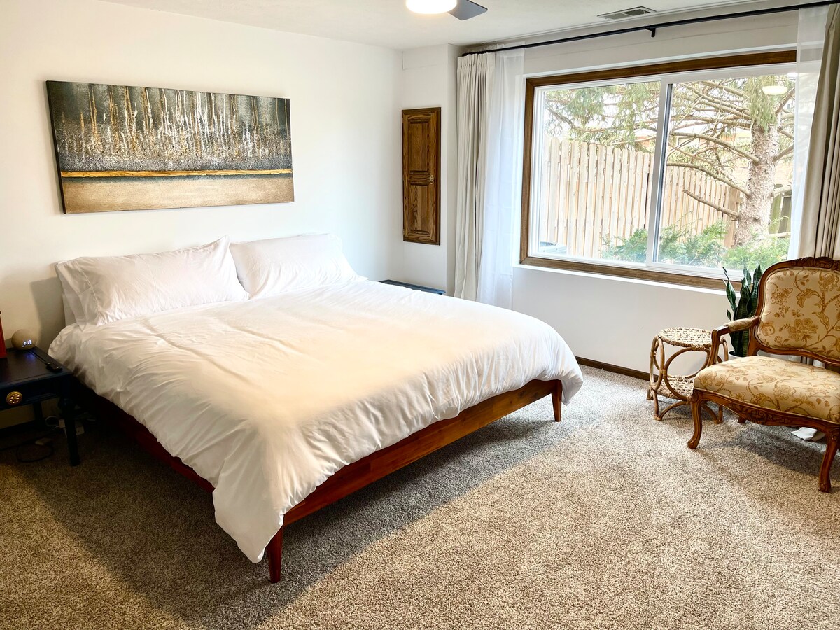 We welcome you to relax in this calm, stylish space. Super-clean! Luxurious therapeutic king bed! 2nd BR is queen. Very comfortable setting watching Smart TV. Two dining areas. Fully furnished kitchen & pantry. Piano for the music-lovers! Patio and backyard. Also picnic tables & grill in the community area. Convenient parking in front of the condo. Quiet, safe community but also near to shopping and restaurants. Pet-free and no smoking, please. Longer stays can be arranged.