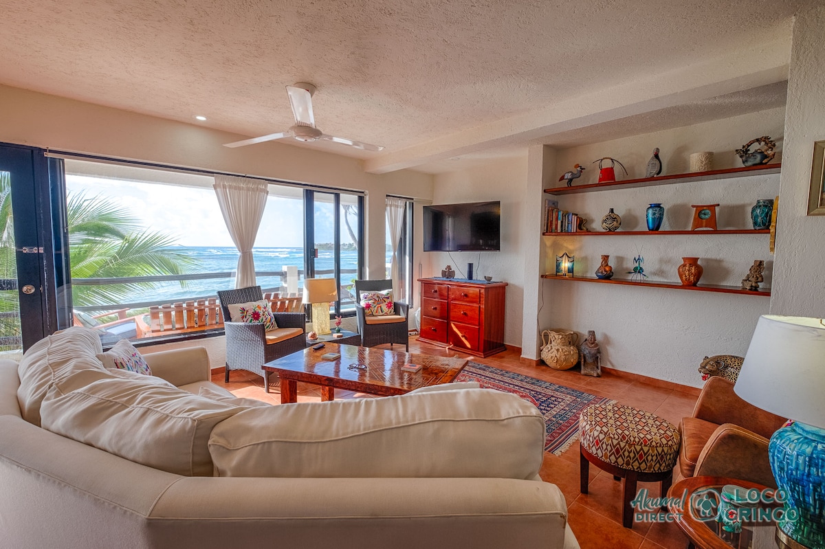 DIRECTLY ON THE BEACH THIS IS OCEANFRONT BEACHFRONT BEAUTIFUL on Caribbean Sea, HMB, Riviera Maya, Akumal MX Imagine waking up & seeing the vast Sea, palm trees, secluded beach, sounds from the tropical birds, amazing sunrises, peace & relaxation. Enjoy the beauty & Mexican culture with your friends & family. Snorkeling steps away, float in new pool, Walk to Restaurants, Grocery, Spa, Lagoon, Akumal Bay. Free parking, Bike/Golf Cart rental, maid service available. Best Sea Views in the Bay!