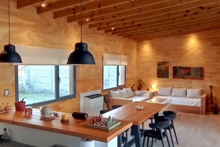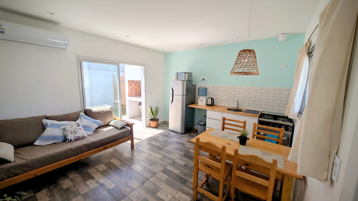 Casa 2 ambientes nueva. Entrada independiente. Garage semi cubierto para un auto. Emplazada en lote de 450 metros cuadrados, parque y árboles. 1 Dormitorio con cama doble y placard nórdico. Cuarto de Baño completo. Cocina totalmente equipada, heladera con freezer, pava eléctrica y microondas. Living, comedor integrados, super luminoso. Ultimas tendencias en Deco. Smart TV / Wi Fi / Alarma inalambrica. Terraza con parrilla y accesorios en espacio semicubierto.