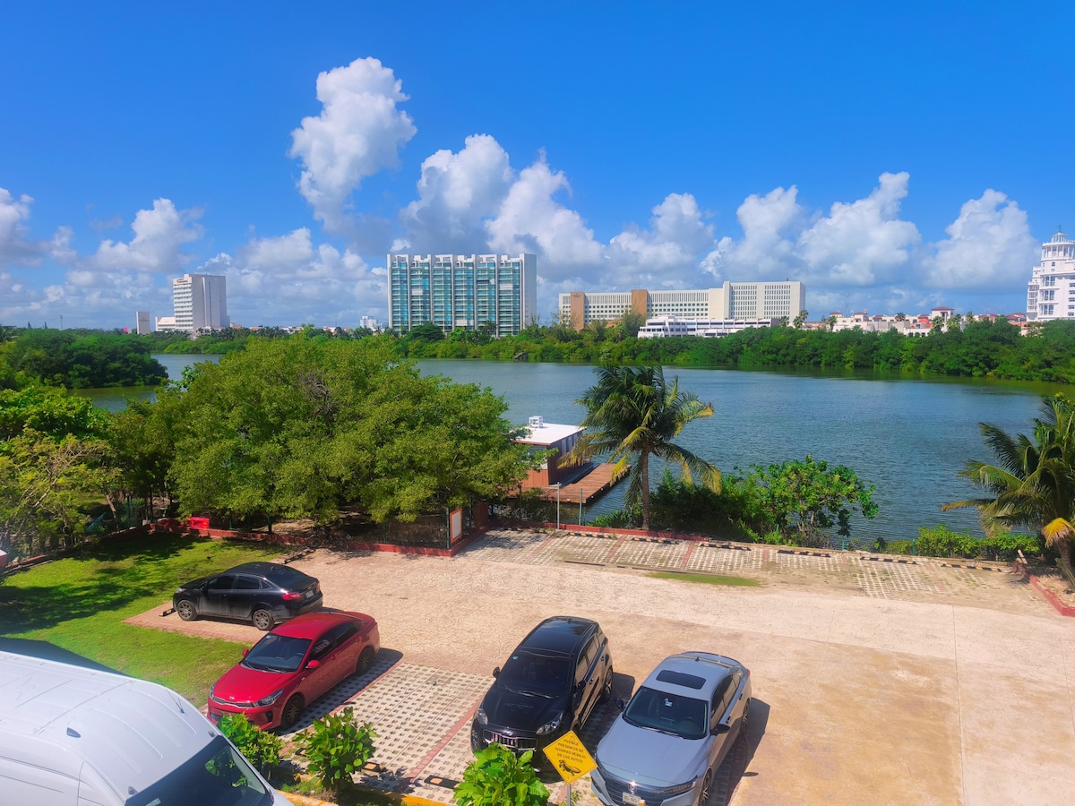 Precioso departamento equipado, muy cómodo y con alberca. Extraordinaria ubicación en la zona turística del centro de Cancún, en una calle tranquila y segura, a pocos pasos del Mercado 28 y de una avenida importante con acceso a camiones de zona hotelera para ir a la playa, por lo que es genial para movilizarse caminando o en transporte público... No necesitas rentar auto! Está cerca de todo! Restaurantes, bancos, lavandería, gimnasio, gasolinera, Oxxo, Walmart y el famoso Mercado 28!