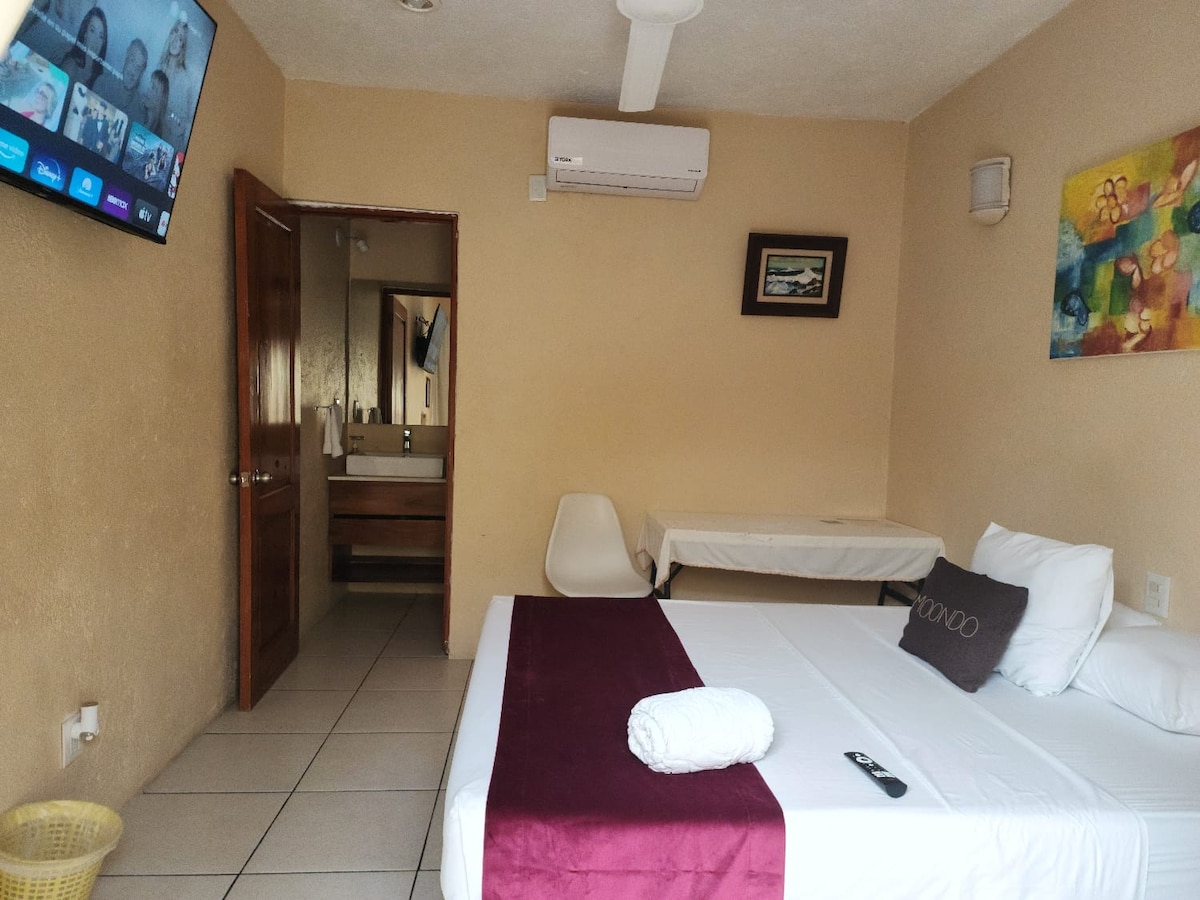 Habitación confortable frente al parque central de Santa Cruz Huatulco. Estarás a sólo 2 minutos caminando de la playa. Ambiente tranquilo, con amenidades y excelente limpieza. Restaurantes, cafés y tiendas de abarrotes a pocos pasos (pasos, no cuadras). En mi familia nos da mucho gusto brindar uno de los mejores servicios de hospedaje en la bahía principal de este destino turístico.