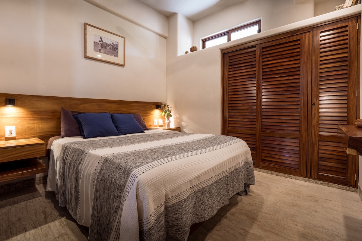 Just one block to the beach, the Studio at Villa Margarita offers a relaxed stay. This two-level studio features a full kitchen with an island on the ground floor. Upstairs, there’s a spacious bedroom with a palapa roof, built-in couch, walk-in closet, and en-suite bathroom. Enjoy Starlink internet, take a dip in the pool, or work out with our dumbbells. Our great location is just a few steps from the beach, with restaurants and shops within walking distance. We look forward to hosting you!