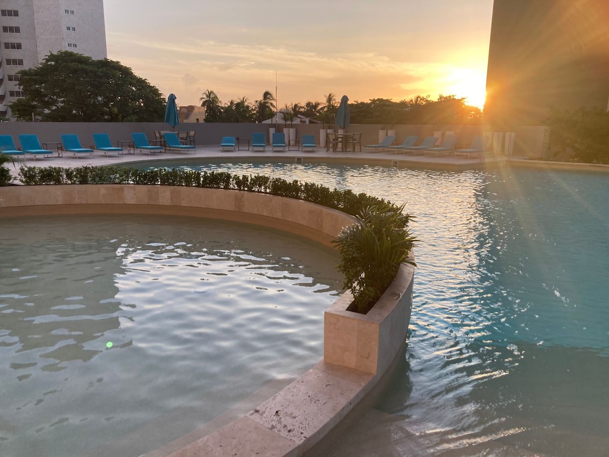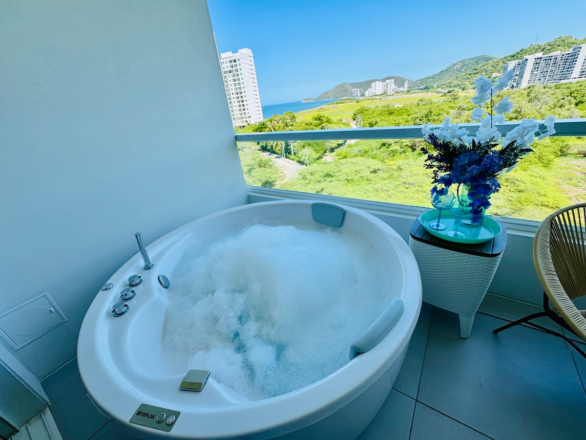 Aparta suite en Porto Horizonte piso 14, hermosa vista donde te relajarás en pareja, podrá disfrutar de un masaje en pareja en este Jacuzzi viendo el atardecer al fondo con el mar caribe de complice. Cama tipo queen con un TV 55’ donde podrás disfrutar tus series favoritas. La suite cuenta con cocina equipada para que puedas preparar un rico desayuno y te tomes un cafe en la mañana. Agua caliente y todo lo necesario para estar tranquilos. El edificio está equipado con una increíble piscina!